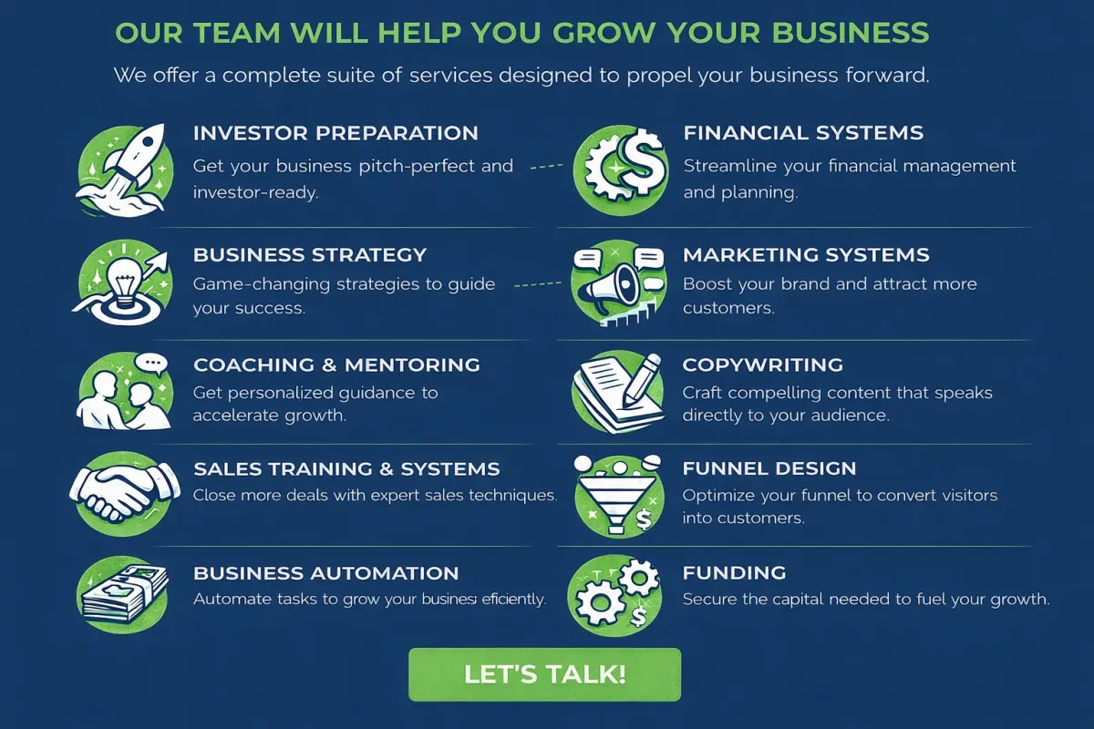 Building a successful business can feel overwhelming—but it doesn’t have to be. With a team that’s been there and done that, you’ll have the guidance and expertise you need to accelerate your growth and avoid costly mistakes. We’ve helped entrepreneurs just like you thrive, and we’re here to do the same for you. Think of us as your trusted partner, ready to offer the mentorship and strategic insights that will take your business to the next level. Let’s fast-track your success together!