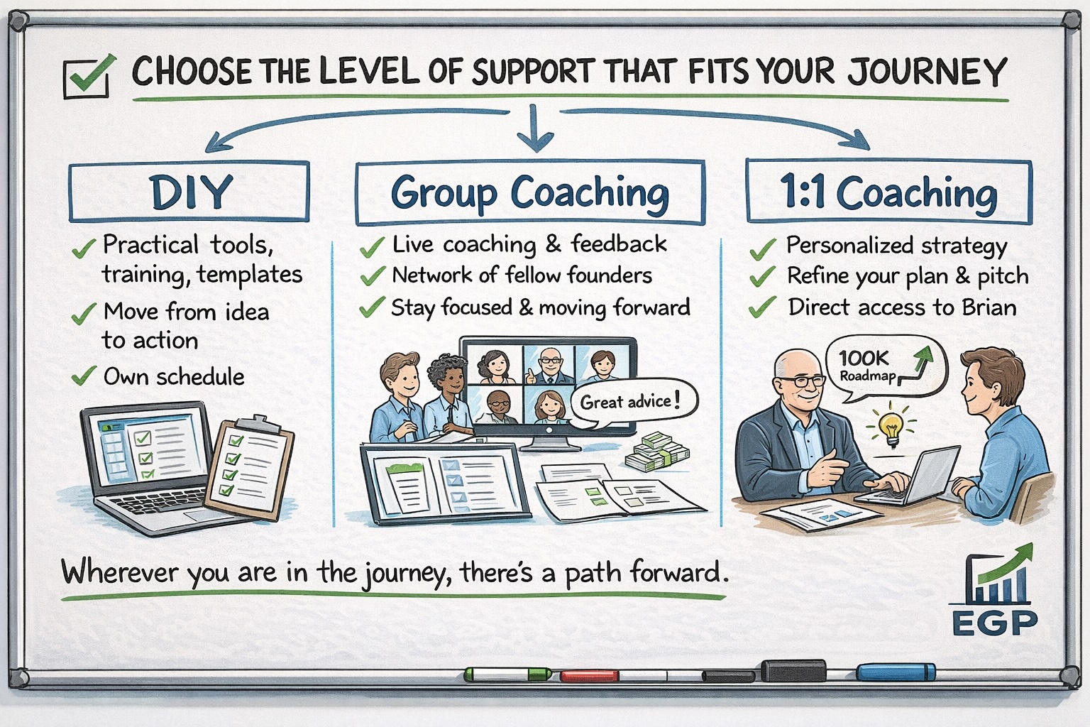 Not every entrepreneur needs the same kind of help. Some people want to learn at their own pace. Others want coaching, feedback, and accountability to move faster. That’s why we offer three ways to grow with The Entrepreneur’s Game Plan.
