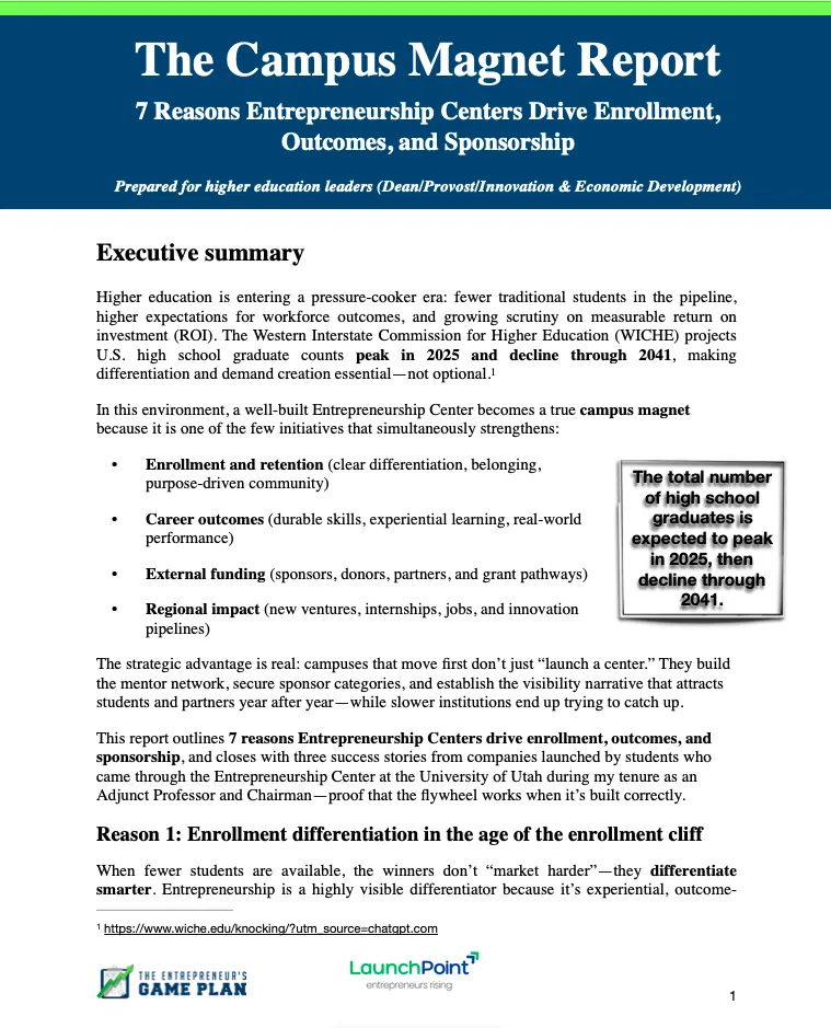 Higher ed leaders are under pressure to prove ROI: enrollment, retention, career readiness, and funding. The Campus Magnet Report shows how a well-built Entrepreneurship Center becomes a high-leverage campus engine that strengthens recruiting, delivers measurable outcomes, and attracts sponsors.